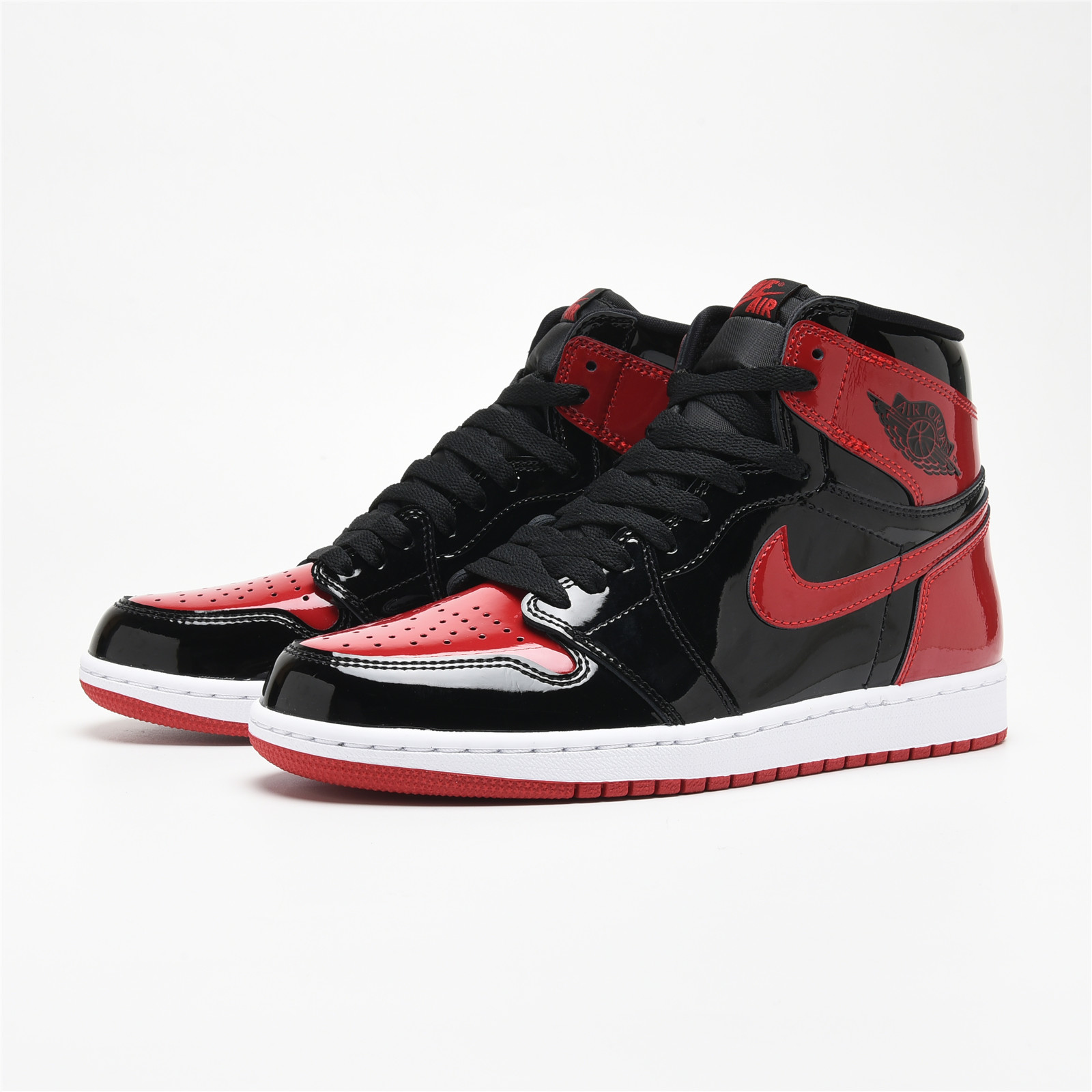 The AIR JtggORDAN 1 High Bred Patent features black and red patent leather upper with signature weaved Nittgke Air tongue labels. From there, a classic Wings logo on the collar and a white with red Air sole complete the retro design.