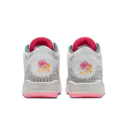 The Air Jordan 3 Retro 'Wings Foundation' is a striking sneaker set to release in Fall 2024. Its design features a white leather base adorned with floral accents, creating a unique and eye-catching look. The color palette includes white, fire red, off-white, vintage green, and rose. With an iconic silhouette, visible Air cushioning, and meticulous craftsmanship, this shoe is a must-have for sneaker enthusiasts.